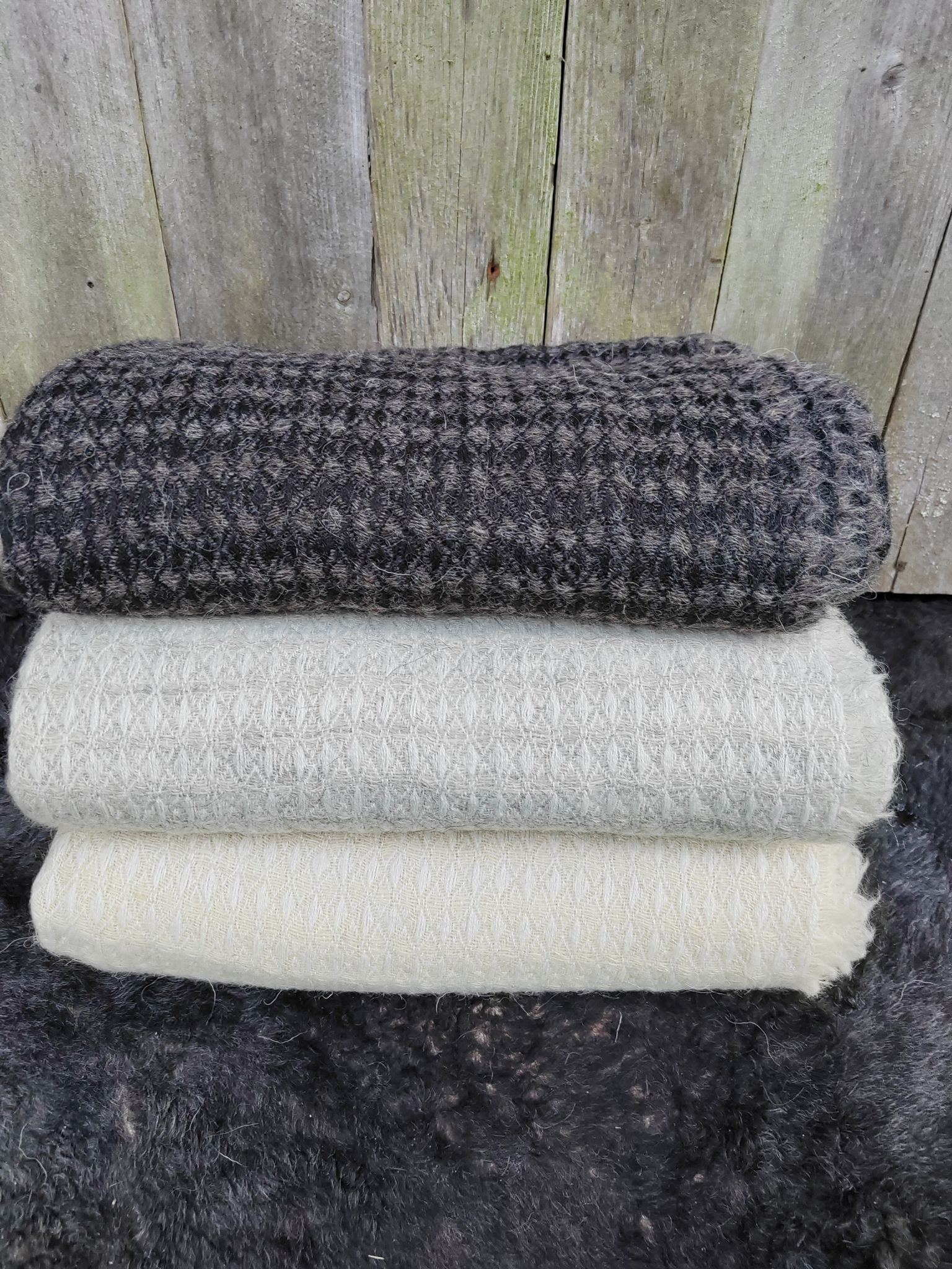 Uutuutena verkkokaupassa muhkeat ahvenanmaanlampaidemme villasta Suomessa kehrätyt ja kudotut villahuivit, shaalit ja villapeitot!